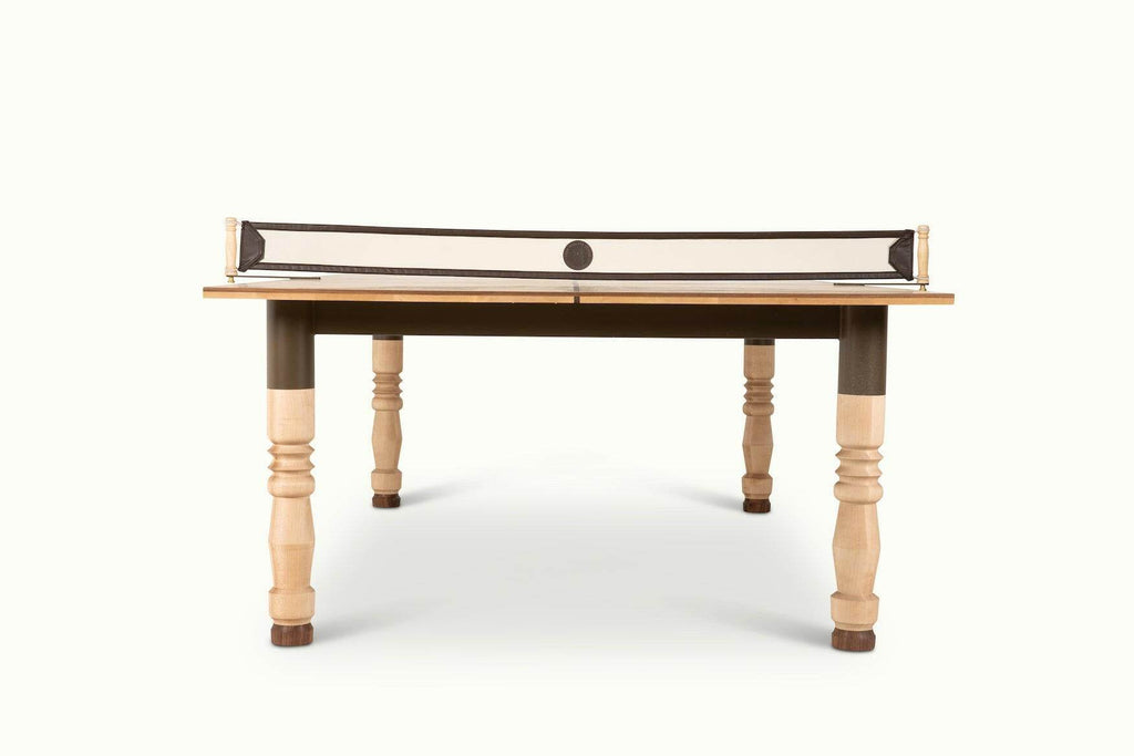 The ClassiCool Ping Pong Table features hand-turned hardwood legs, standing out with its classical architecture-inspired design. Suitable for years of gameplay, it's available in premium hardwoods like walnut, maple, or white oak, with a contrasting centerline and perimeter inlay. The net easily sleeves on and off, seamlessly transitioning to a dining table for 8-10. Finished with a natural, food-safe hand-rubbed oil and wax. Includes two paddles, three balls, and a wall-mounted rack. Available in your choice of powder coat finish. Custom sizes and other add-ons available.
