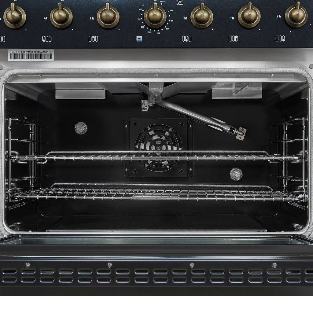 Elevate your kitchen with the stylish and high-performance Forno Antico 36" Gas Range in black, designed to bring elegance, functionality and affordability to your home. With 6 sealed burners and a total output of 71,000 BTU, it delivers the power and precision needed for any culinary challenge. The dual-ring brass burner offers up to 20,000 BTU for high-heat searing and 1,000 BTU for simmering, providing exceptional control. Its spacious 4.5 cu. ft. convection oven ensure even baking and roasting. With its elegant black finish and antique brass accents, the Antico exudes sophistication, while the cast-iron grates provide lasting stability and durability. The recessed enamel cooktop makes cleanup a breeze, combining style with practicality. Whether you're preparing a weeknight dinner or hosting a dinner party, the Antico offers the versatility and power to handle it all, while enhancing the beauty of your kitchen.