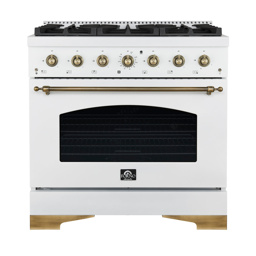 Elevate your kitchen with the stylish and high-performance Forno Antico 36" Gas Range in white, designed to bring elegance, functionality and affordability to your home. With 6 sealed burners and a total output of 71,000 BTU, it delivers the power and precision needed for any culinary challenge. The dual-ring brass burner offers up to 20,000 BTU for high-heat searing and 1,000 BTU for simmering, providing exceptional control. Its spacious 4.5 cu. ft. convection oven ensure even baking and roasting. With its elegant white finish and antique brass accents, the Antico exudes sophistication, while the cast-iron grates provide lasting stability and durability. The recessed enamel cooktop makes cleanup a breeze, combining style with practicality. Whether you're preparing a weeknight dinner or hosting a dinner party, the Antico offers the versatility and power to handle it all, while enhancing the beauty of your kitchen.