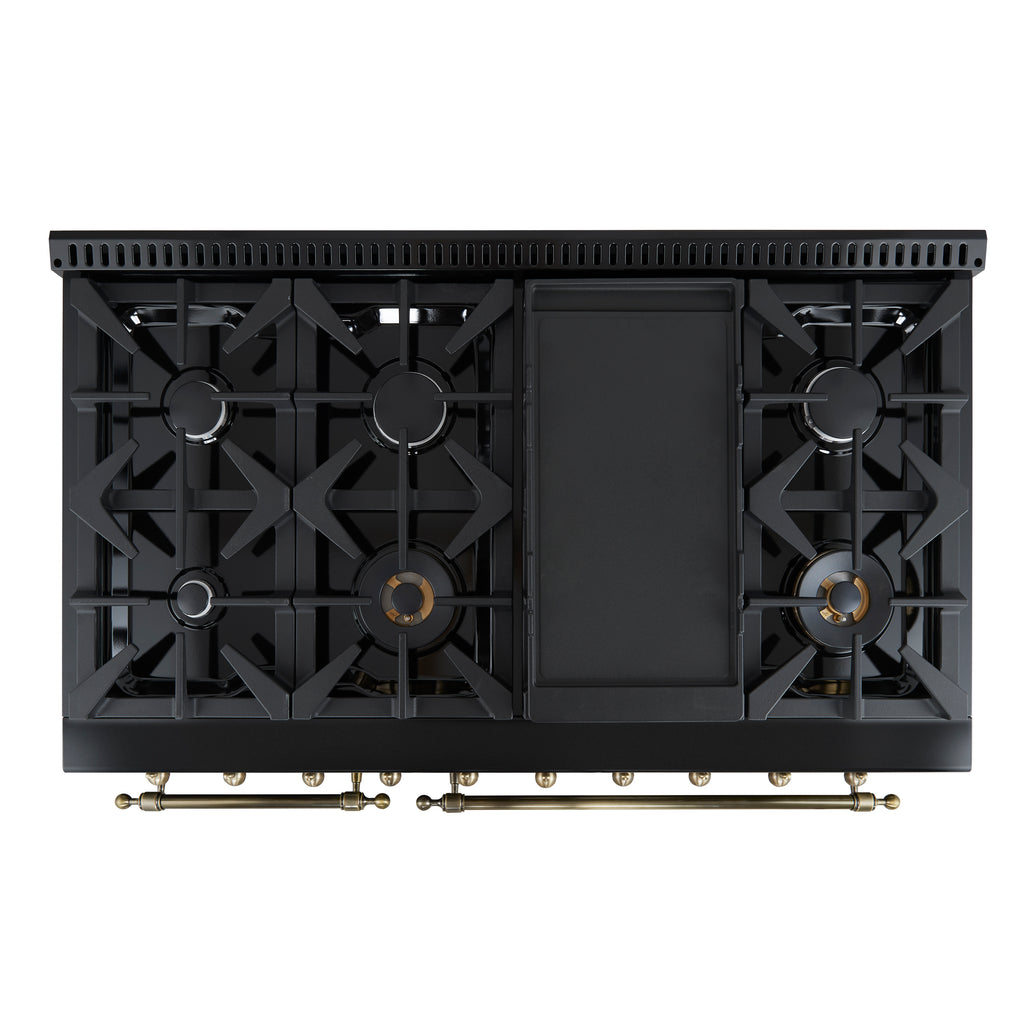 Elevate your kitchen with the stylish and high-performance Forno Antico 48" Gas Range in black, designed to bring elegance, functionality and affordability to your home. With 8 sealed burners and a total output of 94,000 BTU, it delivers the power and precision needed for any culinary challenge. The two dual-ring brass burners offer up to 20,000 BTU for high-heat searing and 1,000 BTU for simmering, providing exceptional control. Its 3.5 cu. ft. convection oven, along with an additional 2 cu. ft. oven, provides ample room for big family meals. With its elegant black finish and antique brass accents, the Antico exudes sophistication, while the cast-iron grates provide lasting stability and durability. The recessed enamel cooktop makes cleanup a breeze, combining style with practicality. Whether you're preparing a weeknight dinner or hosting a dinner party, the Antico offers the versatility and power to handle it all, while enhancing the beauty of your kitchen.