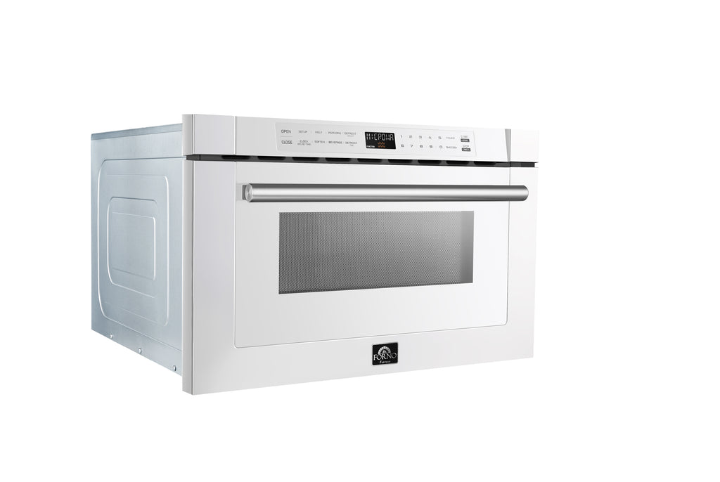 Upgrade your kitchen with the Forno Capolivera 24" Microwave Drawer, designed for effortless cooking. Featuring a 1.2 cu. ft. capacity, this white microwave with antique brass accents delivers 1,000 watts of power for fast, even heating—boiling water in just 1 minute and 50 seconds. With 11 power levels, you can precisely control cooking temperatures for everything from reheating to gourmet prep. Glass touch controls and an LED display offer a modern, user-friendly experience, while pre-programmed settings make it easy to melt butter, chocolate, and more. Enjoy versatile cooking modes, including defrost, popcorn, and beverage heating. The spacious interior accommodates 7-inch coffee mugs and 16 x 16-inch dishes, making it perfect for everyday use.