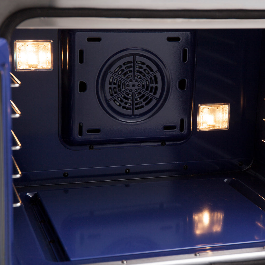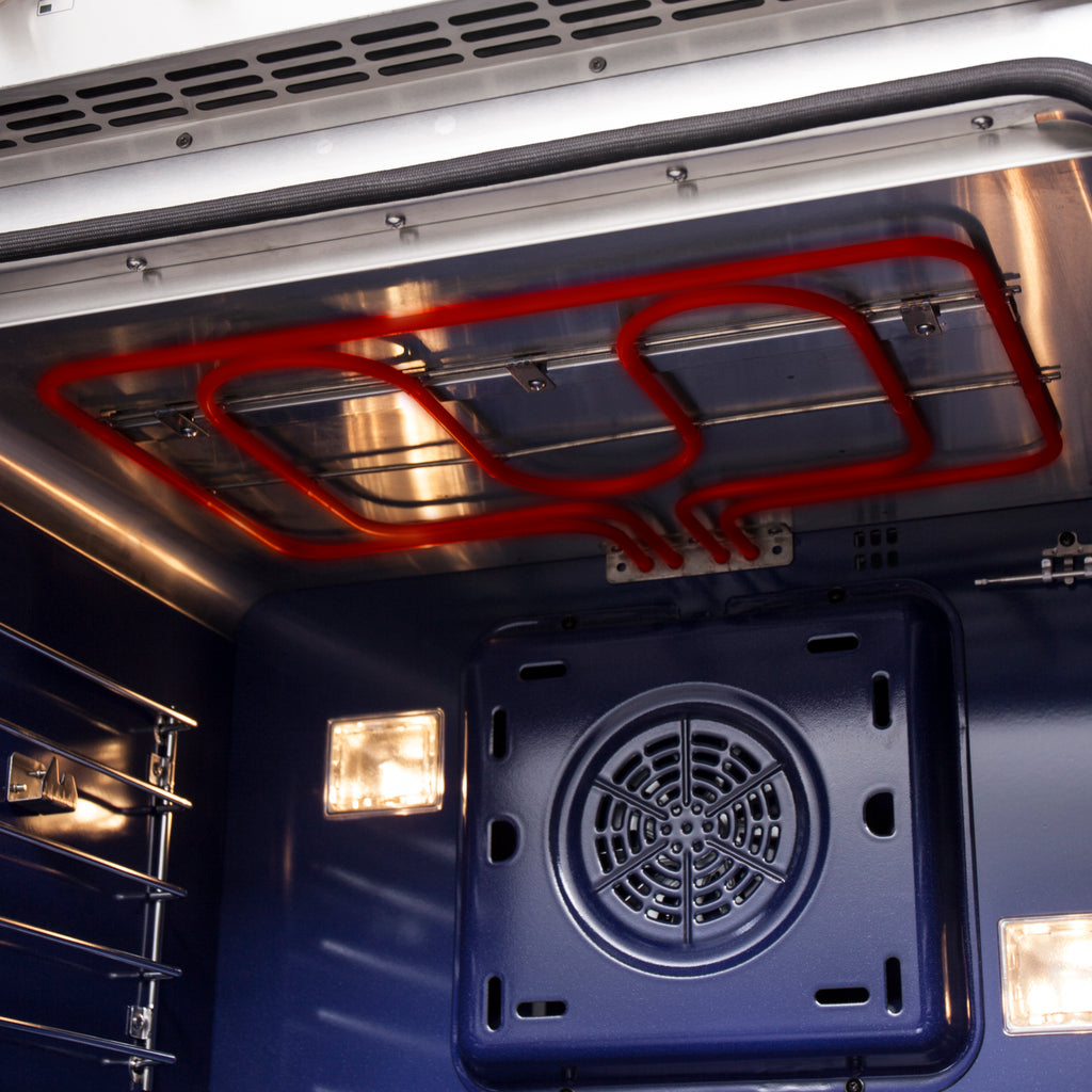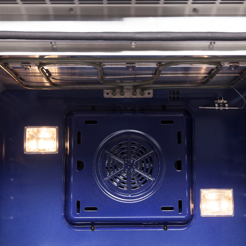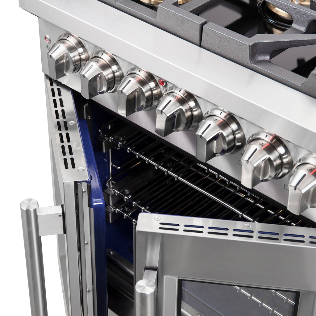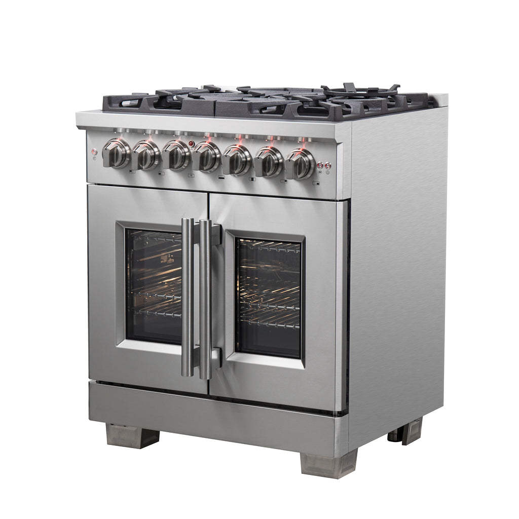 The Forno Capriasca 30-Inch french door dual fuel range harmonizes professional styling and performance into your home kitchen with its durable stainless-steel design. Unique french doors mean open doors allow up to 12 Inch of more space to access your oven. The gas range-top has 5 sealed dual-ring brass burners with a total output of 100,000 BTU for simmering melting chocolate or simmering sauces, 20K dual-ring burner for boiling or searing and is able to perform simmering like melting chocolate or sauces. The heavy-duty continuous cast iron grates allow maximum stability of cookware and mobility over a recessed enamel Cooking Surface cavity which keeps spills and splashes contained and easy to clean. The 4.32 cu. ft. electric oven with a total output of 6,300 Watts is encased in a speckled blue enamel interior fitted with a true convection fan, ensures to achieve fast, precision and consistent oven cooking along for easy viewing is a 3-layer glass oven door window. Included is an LP conversion kit, 3 stainless steel telescopic oven racks, wok-ring, reversible griddle, rotisserie kit and skewers forks, air fry basket with rack and drip pan. Additionally, zinc coated metal knobs with bezel rings will maintain their beauty for years.