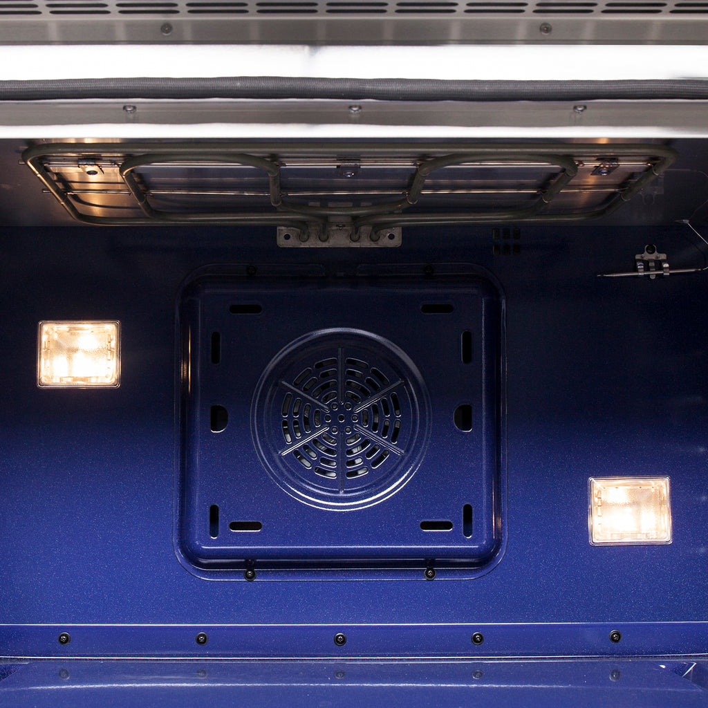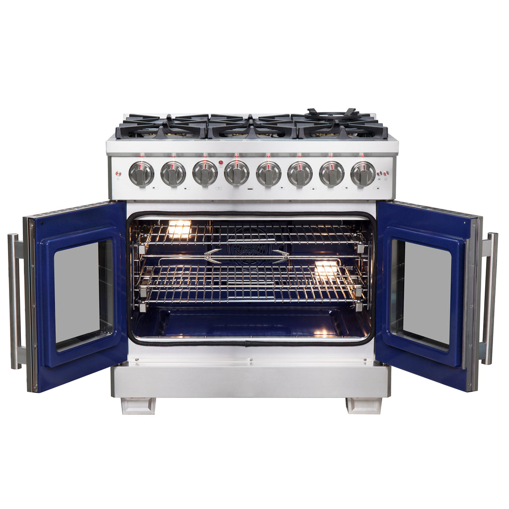 The Forno Capriasca 36-Inch french door dual fuel range harmonizes professional styling and performance into your home kitchen with its durable stainless-steel design. Unique french doors mean open doors allow up to 12 Inch of more space to access your oven. The gas rangetop has 6 sealed dual-ring brass burners with a total output of 120,000 BTU for simmering melting chocolate or simmering sauces. The heavy-duty continuous cast iron grates allow maximum stability of cookware and mobility over a recessed enamel Cooking Surface cavity which keeps spills and splashes contained and easy to clean. The 5.36 cu. ft. true convection oven with a total output of 6,300 Watts is encased in a speckled blue enamel interior, ensures fast, precise and consistent cooking along for easy viewing is a 3-layer glass oven door window. Included is an LP conversion kit, 3 stainless steel telescopic oven racks, wok support, reversible griddle, rotisserie kit and skewers forks, air fry basket with rack and drip pan. Additionally, zinc coated metal knobs with bezel rings will maintain their beauty for years.
