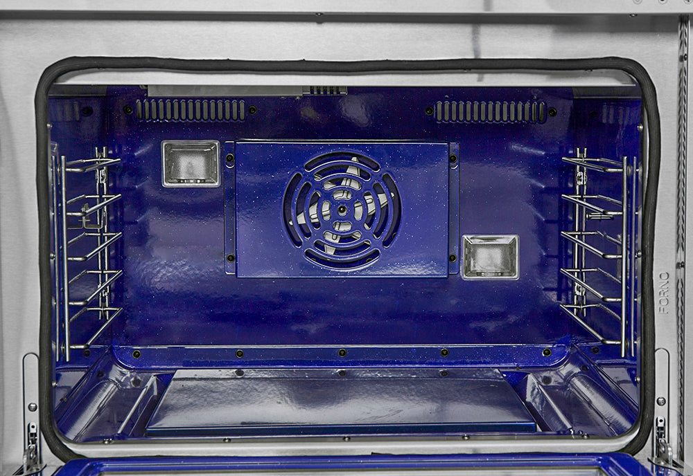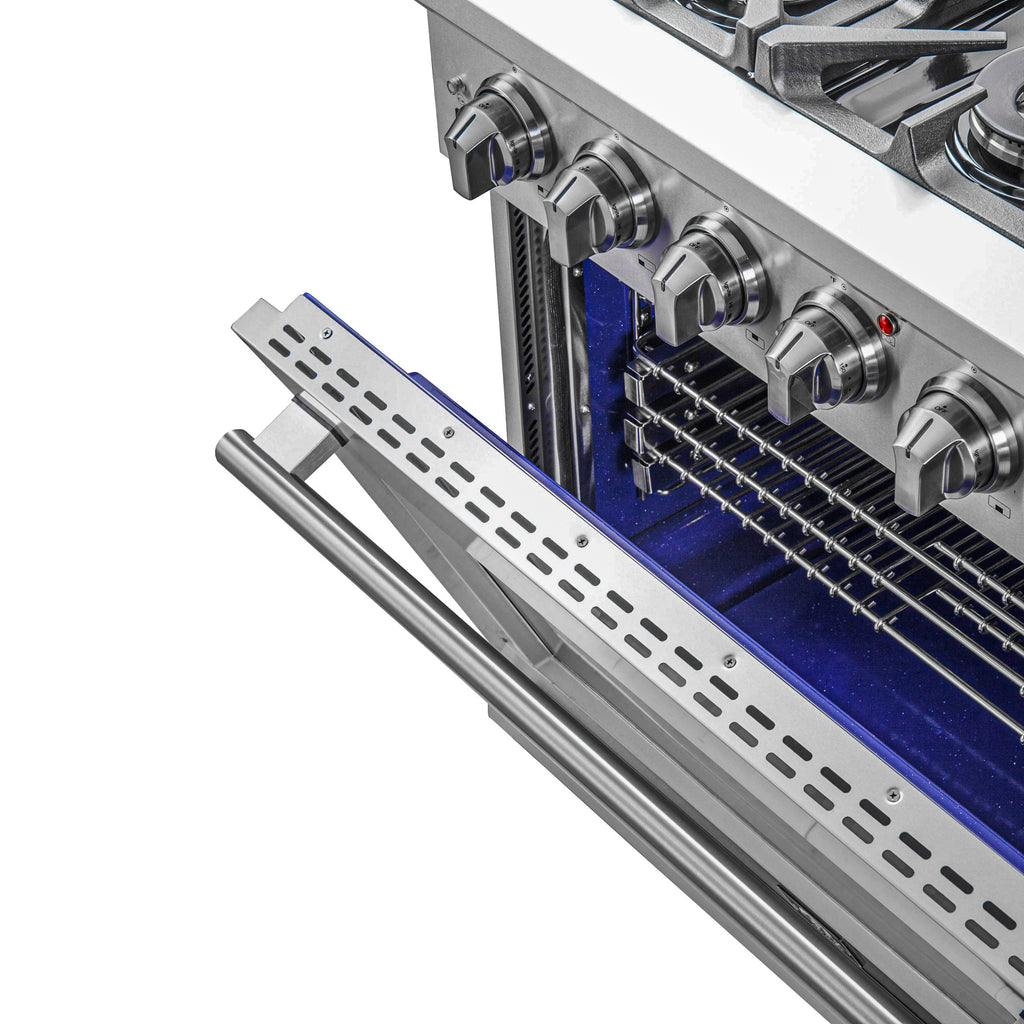 The Forno Capriasca 36 Inch Gas Range enhances your home kitchen with professional styling and performance through its durable and beautiful 304-grade stainless-steel design. The cooking surface features 6 sealed dual-ring brass burners, totaling 120,000 BTU. All burners, each at 20,000 BTU, can simmer precisely at 1,000 BTU. Continuous heavy-duty cast-iron grates facilitate easy sliding of pots or pans off heat over the enamel cooktop cavity, simplifying spill cleanup. The 5.36 cu. ft. gas oven, with a 30,000 BTU output and infrared red mesh broiler, enclosed in a blue enamel interior, offers optional convection for precise, and consistent cooking on multiple levels. For convenient viewing, a 3-layer glass oven door window is included. The package includes 3 telescopic stainless-steel oven racks, wok support, and an LP conversion kit. Additionally, zinc-coated illuminated metal knobs with bezel rings ensure enduring beauty.
