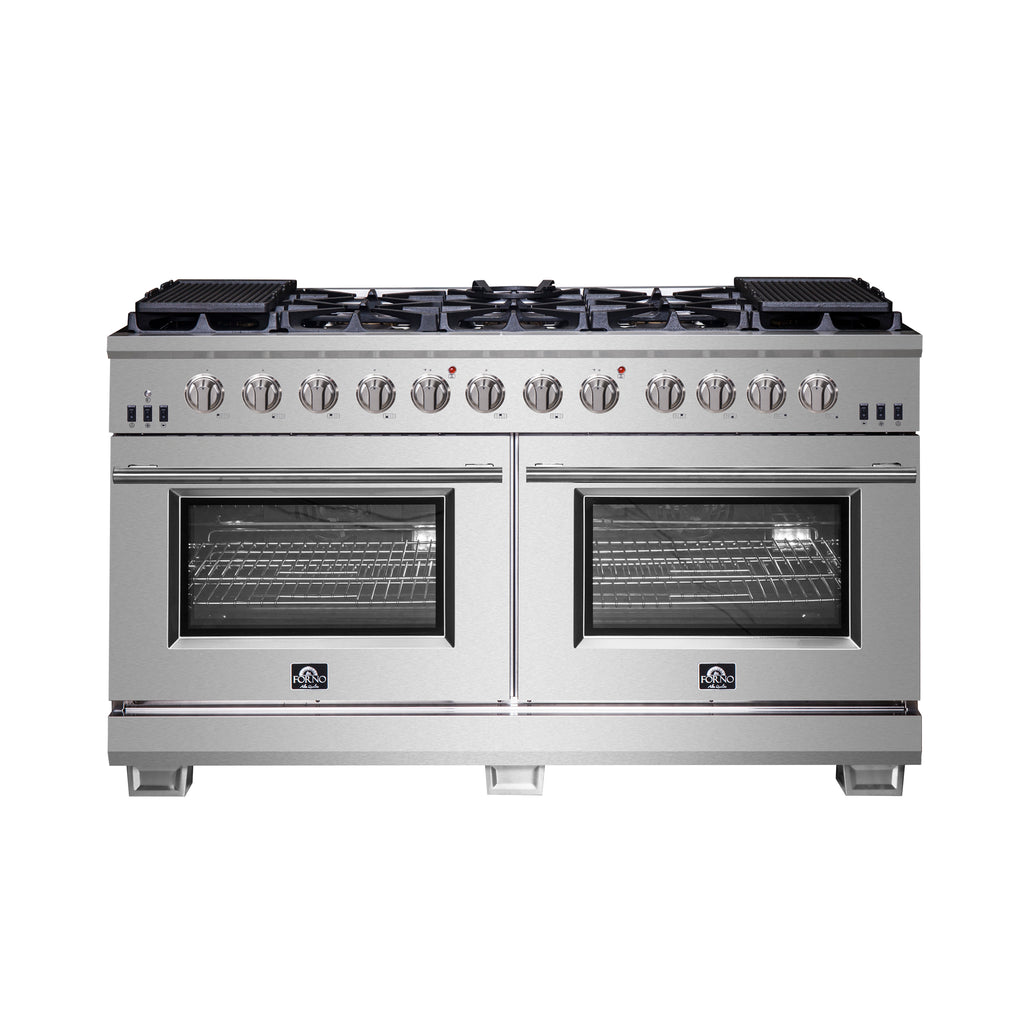 The Forno Capriasca 60 Inch Gas Range enhances your home kitchen with professional styling and performance through its durable and beautiful 304-grade stainless-steel design. The cooking surface features 10 sealed dual-ring brass burners, totaling 200,000 BTU. All burners, each at 20,000 BTU, can simmer precisely at 1,000 BTU. Continuous heavy-duty cast-iron grates facilitate easy sliding of pots or pans off heat over the enamel cooktop cavity, simplifying spill cleanup. Two ovens, each with a 30,000 BTU output, are enclosed in a blue enamel interior. Both 4.32 cu.ft. ovens offers a powerful 10,000 BTU infrared mesh broilers, a rotisserie skewer and a convection fan for precise, and consistent cooking on multiple levels. The package includes 6 telescopic stainless-steel oven racks, 2 rotisserie kit, wok support, 2 griddles, 1 air-fryer kit with drip pan and an LP conversion kit. Additionally, zinc-coated illuminated metal knobs with bezel rings ensure enduring beauty.