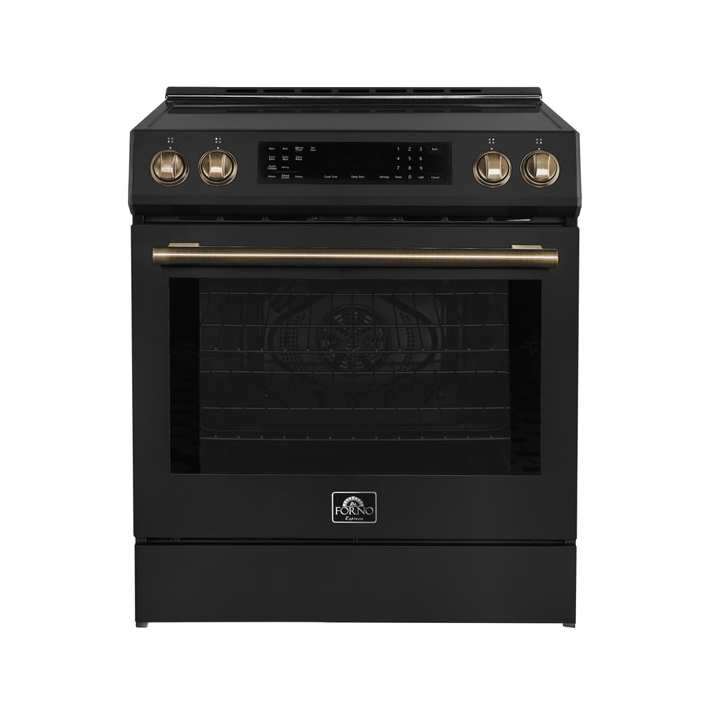 The Forno Donatello 30" in black features an intuitive digital display, offering effortless control over all cooking functions. The built-in air fry function eliminates the need for extra appliances, allowing you to create crispy, delicious meals while saving counter space. Experience superior performance with automatic convection conversion, which optimizes time and temperature for perfect results. The ceramic glass cooktop ensures even heat distribution and smooth cookware movement, while the finish provides durability, heat resistance, and a sleek, easy-to-clean surface. The 5.0 cu. ft. true convection oven is powered by a 2,500-watt convection system and a 5,800-watt total broil and bake output, delivering consistent, professional-grade cooking. With two oven racks, you can bake, roast, and broil multiple dishes at once.