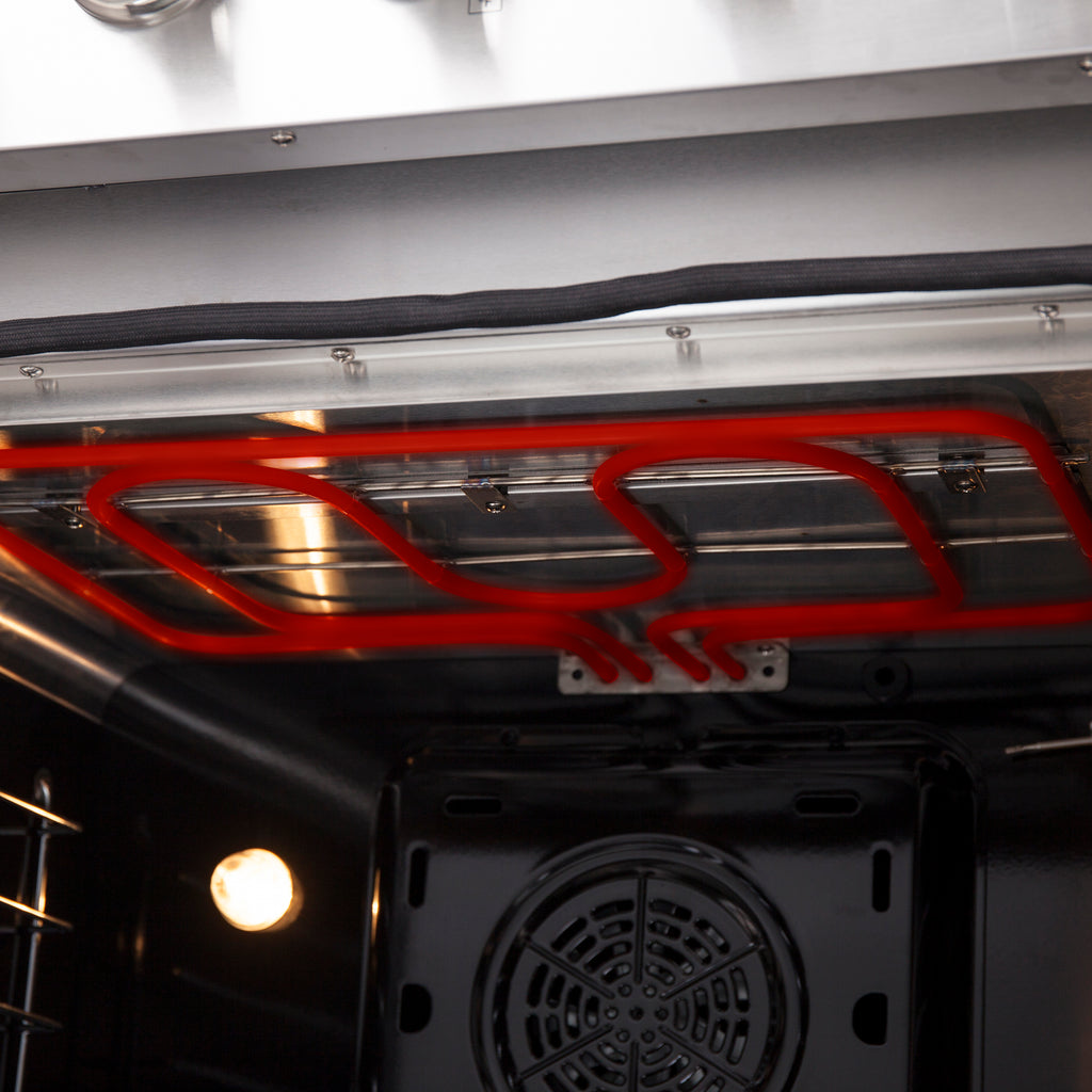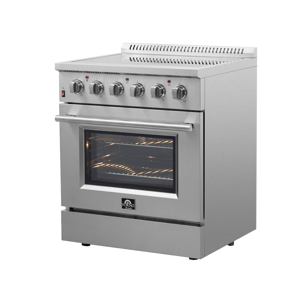 The Forno Galiano 30 Inch Freestanding Pro-Style Electric Range elevates your home kitchen with professional styling and enduring quality, featuring a robust stainless-steel design. Boasting 4 radiant elements, the cooking surface delivers a total output of 6,500 watts. The 4.32 cu. ft. capacity true convection oven enhances cooking flexibility with a combined broil and bake output of 4,800 watts, complemented by a 1,500 watts true convection fan for precision. This unit includes 2 electroplated oven racks, an Air Fryer kit, and a 4-prong power cord (NEMA 14-50P), providing both versatility and convenience.
