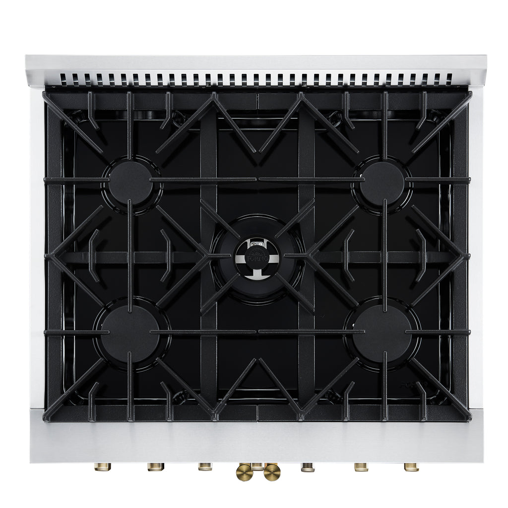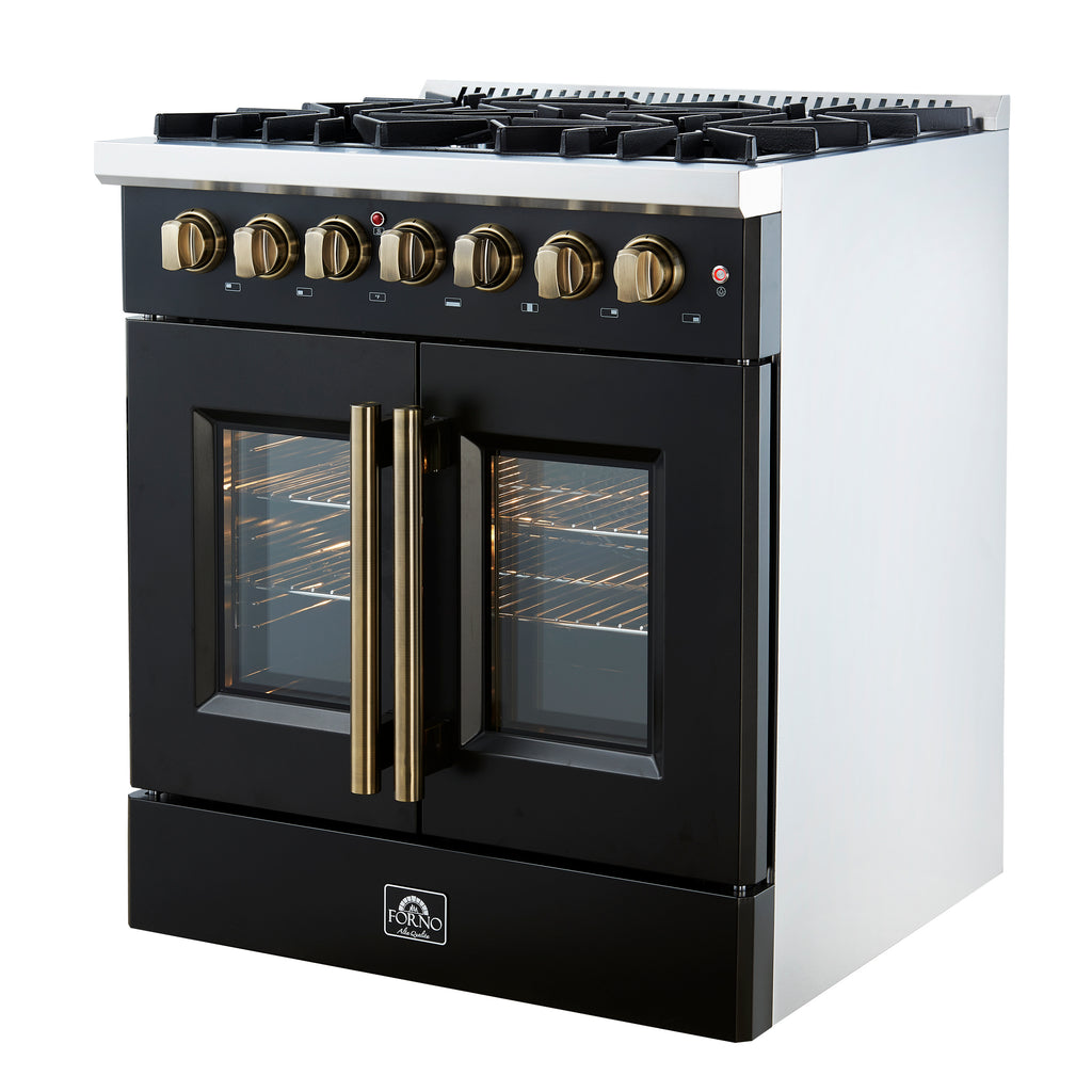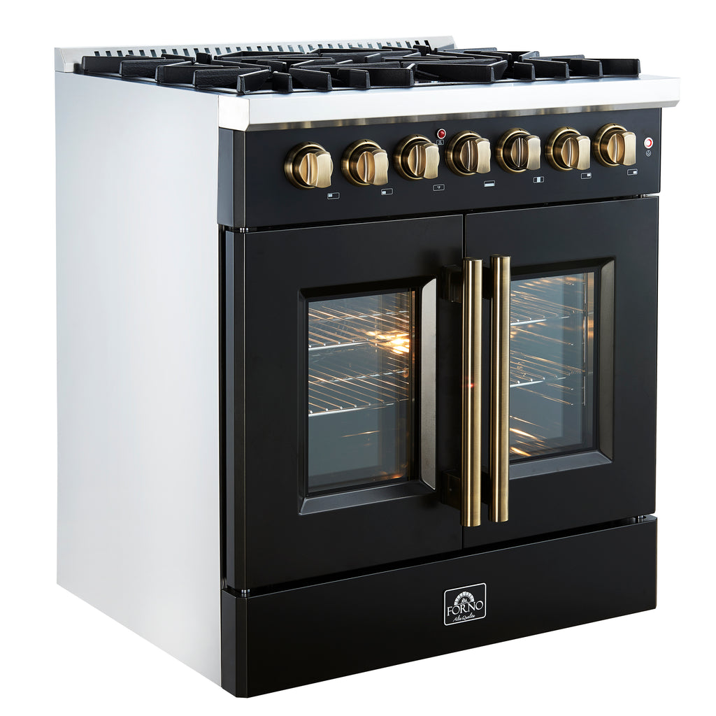 Our 30" Galiano Dual Fuel French Door Range blends timeless design and high performance. Featuring a sleek black finish and antique brass knobs, this range adds sophistication to any kitchen at an affordable price. The cooktop boasts five sealed burners with a total output of 68,000 BTU, including a 20,000 BTU dual-ring burner ideal for boiling, searing, or simmering delicate sauces. The heavy-duty cast iron grates provide a stable surface and allow you to slide cookware effortlessly across the cooktop. Its spacious 4.32 cu.ft. true convection oven delivers even heat distribution, powered by 6,300 watts, for perfectly baked and roasted dishes. Easy-to-clean black enamel interiors, French door convenience, and included electroplated racks make this range as practical as it is beautiful. Complete with an LP conversion kit and NEMA 14-50 power cord, the Galiano Range is built for both style and efficiency.