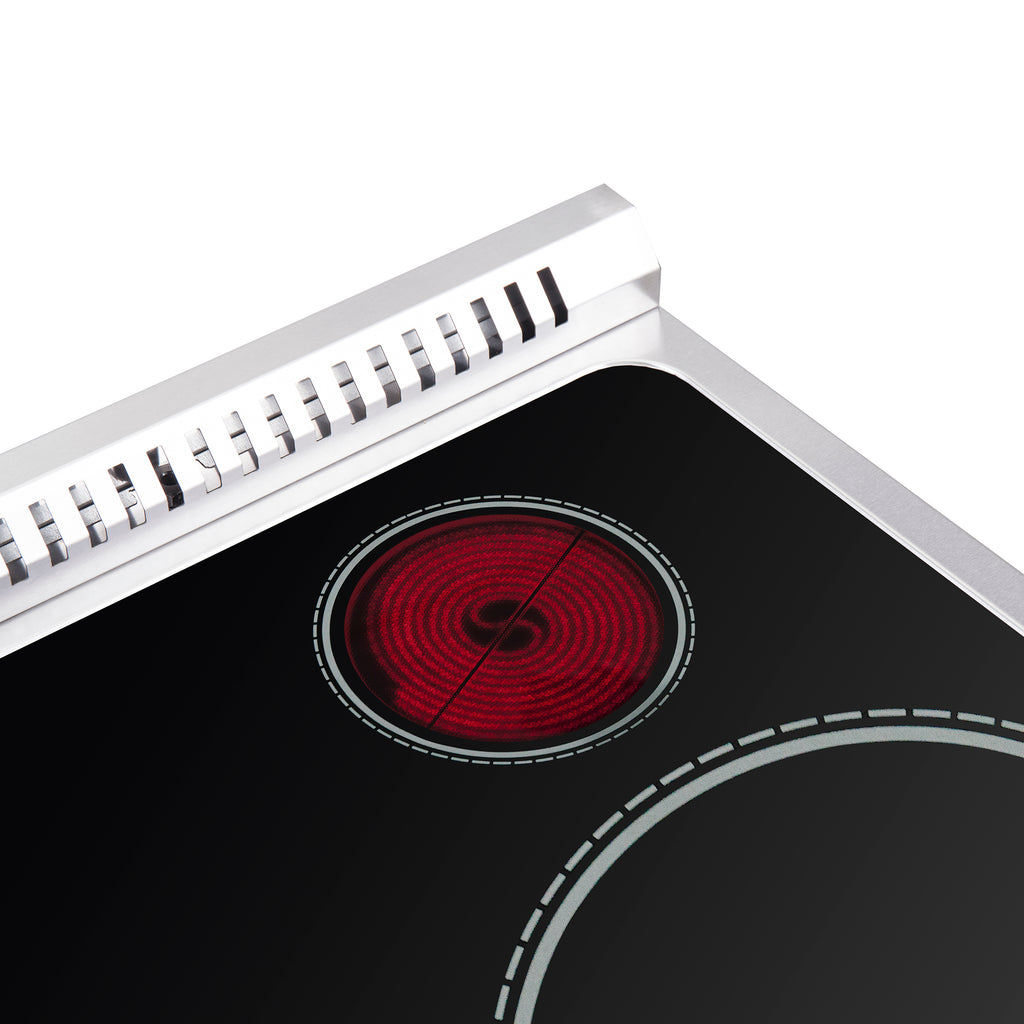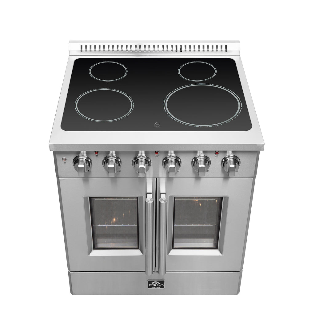 The Forno Galiano 30 Inch French Door Alta Qualita Pro-Style Freestanding Electric Range elevates your home kitchen with professional styling and enduring quality, featuring a robust stainless-steel design. The french door design will make your everyday cooking task easier allowing up to 12 Inch opening for an easy access of your oven. Boasting 4 radiant elements, the cooking surface delivers a total output of 6,500 watts. The 4.32 cu. ft. capacity true convection oven enhances cooking flexibility with a combined broil and bake output of 4,800 watts, complemented by a 1,500 watts true convection fan for precision. This unit includes 2 electroplated oven racks, an Air Fryer kit, and a 4-prong power cord (NEMA 14-50P), providing both versatility and convenience.