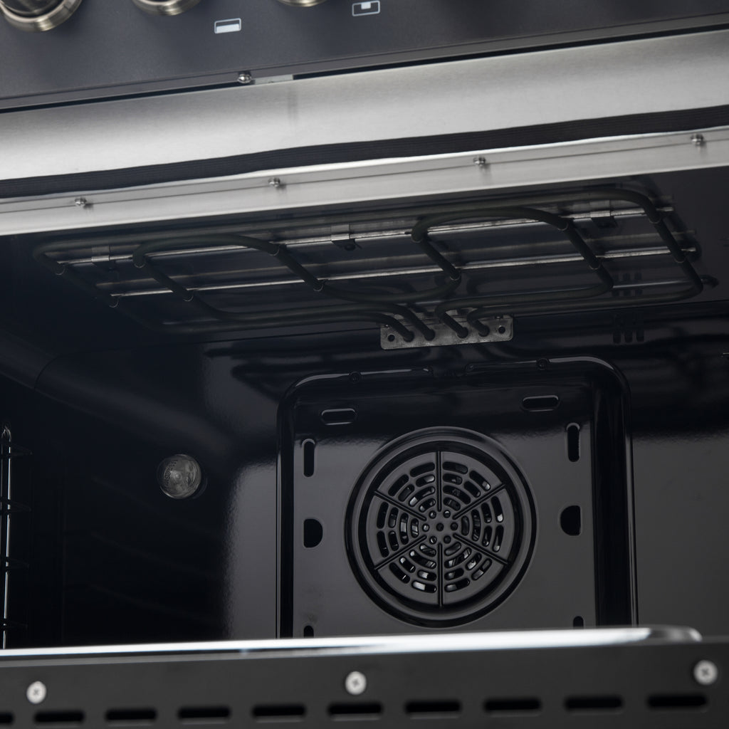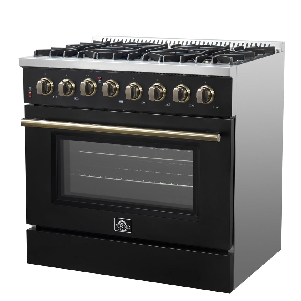 The Galiano 36" Dual Fuel Range blends professional style and performance in sleek black with antique brass accessories. Featuring six sealed burners with a total output of 83,000 BTU, including a powerful 20K dual-ring burner for boiling or searing, it gently simmers delicate foods, such as chocolate and sauces. The cast iron grates provide stability and smooth pan sliding, while the 5.26 cu. ft. electric oven delivers 6,300 watts of power, making it perfect for baking, roasting, and broiling with true convection options. Included are two oven racks, an LP conversion kit, and elegant zinc-coated metal knobs with bezel rings that retain their beauty.