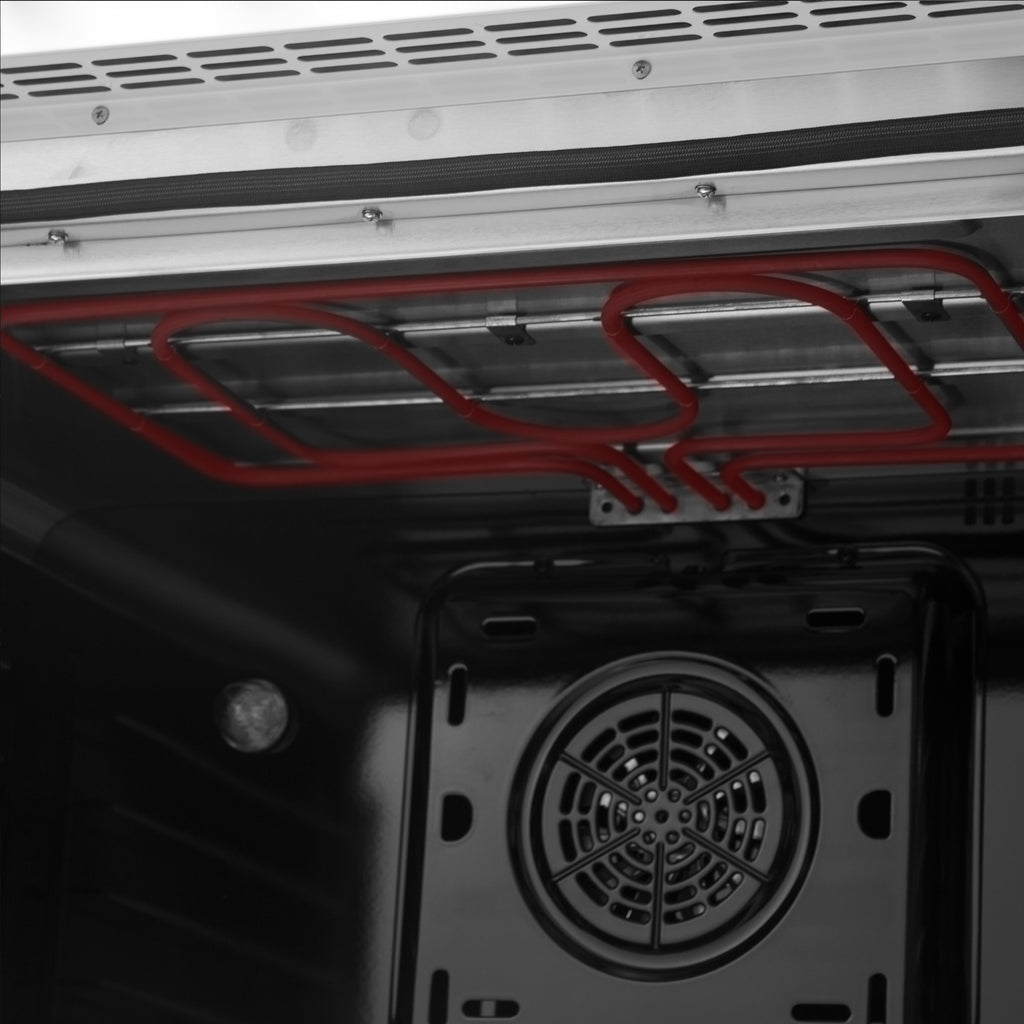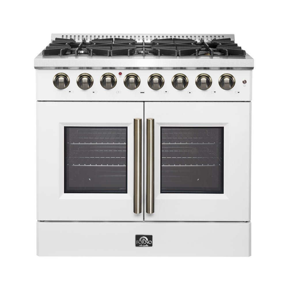 Our 36" Galiano Dual Fuel French Door Range blends timeless design and high performance. Featuring a crisp white finish and antique brass knobs, this range adds sophistication to any kitchen at an affordable price. The cooktop boasts six sealed burners with a total output of 83,000 BTU, including a 20,000 BTU dual-ring burner ideal for boiling, searing, or simmering delicate sauces. The heavy-duty cast iron grates provide a stable surface and allow you to slide cookware effortlessly across the cooktop. Its spacious 5.36 cu.ft. true convection oven delivers even heat distribution, powered by 6,300 watts, for perfectly baked and roasted dishes. Easy-to-clean black enamel interiors, French door convenience, and included electroplated racks make this range as practical as it is beautiful. Complete with an LP conversion kit and NEMA 14-50 power cord, the Galiano Range is built for both style and efficiency.