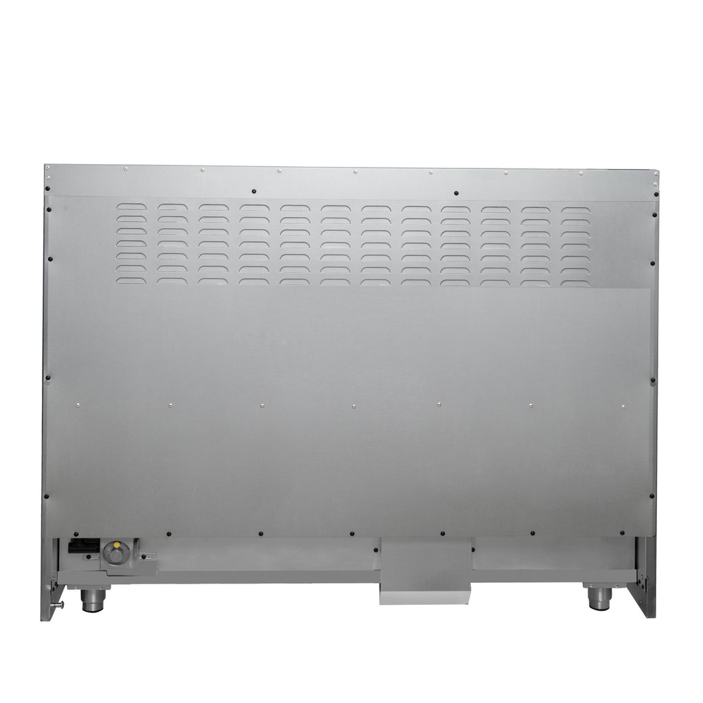 Our 48" Galiano Dual Fuel French Door Range blends timeless design and high performance. Featuring a sleek black finish and antique brass knobs, this range adds sophistication to any kitchen at an affordable price. The cooktop boasts eight sealed burners with a total output of 107,000 BTU, including a 20,000 BTU dual-ring burner ideal for boiling, searing, or simmering delicate sauces. The heavy-duty cast iron grates provide a stable surface and allow you to slide cookware effortlessly across the cooktop. Its spacious 6.58 cu.ft. true convection oven delivers even heat distribution, powered by 9,700 watts, for perfectly baked and roasted dishes. Easy-to-clean black enamel interiors, French door convenience, and included electroplated racks make this range as practical as it is beautiful. Complete with an LP conversion kit and NEMA 14-50 power cord, the Galiano Range is built for both style and efficiency.