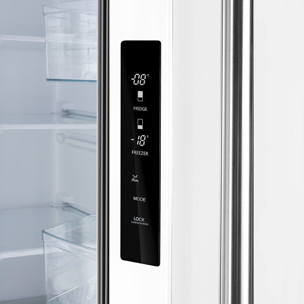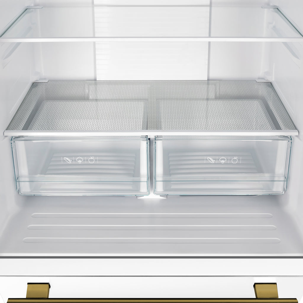 The Forno Gallipoli 30" French Door Refrigerator in white offers a perfect blend of style, efficiency, and modern cooling technology. Its 17.5 cu. ft. capacity includes 12.4 cu. ft. of fresh food storage with adjustable glass shelves, crisper drawers, and spacious door bins, while the 5.1 cu. ft. freezer features a pull-out drawer, dual storage bins, and an automatic ice maker producing up to 4 lbs. of ice daily. A high-efficiency inverter compressor ensures quiet operation and precise temperature control, while the LED touch panel allows effortless adjustments. ENERGY STAR Certified for optimal performance, this refrigerator also features bright LED lighting to reduce spoilage. Finished with antique brass handles and a modern decorative grill, it adds a sophisticated touch to any kitchen.