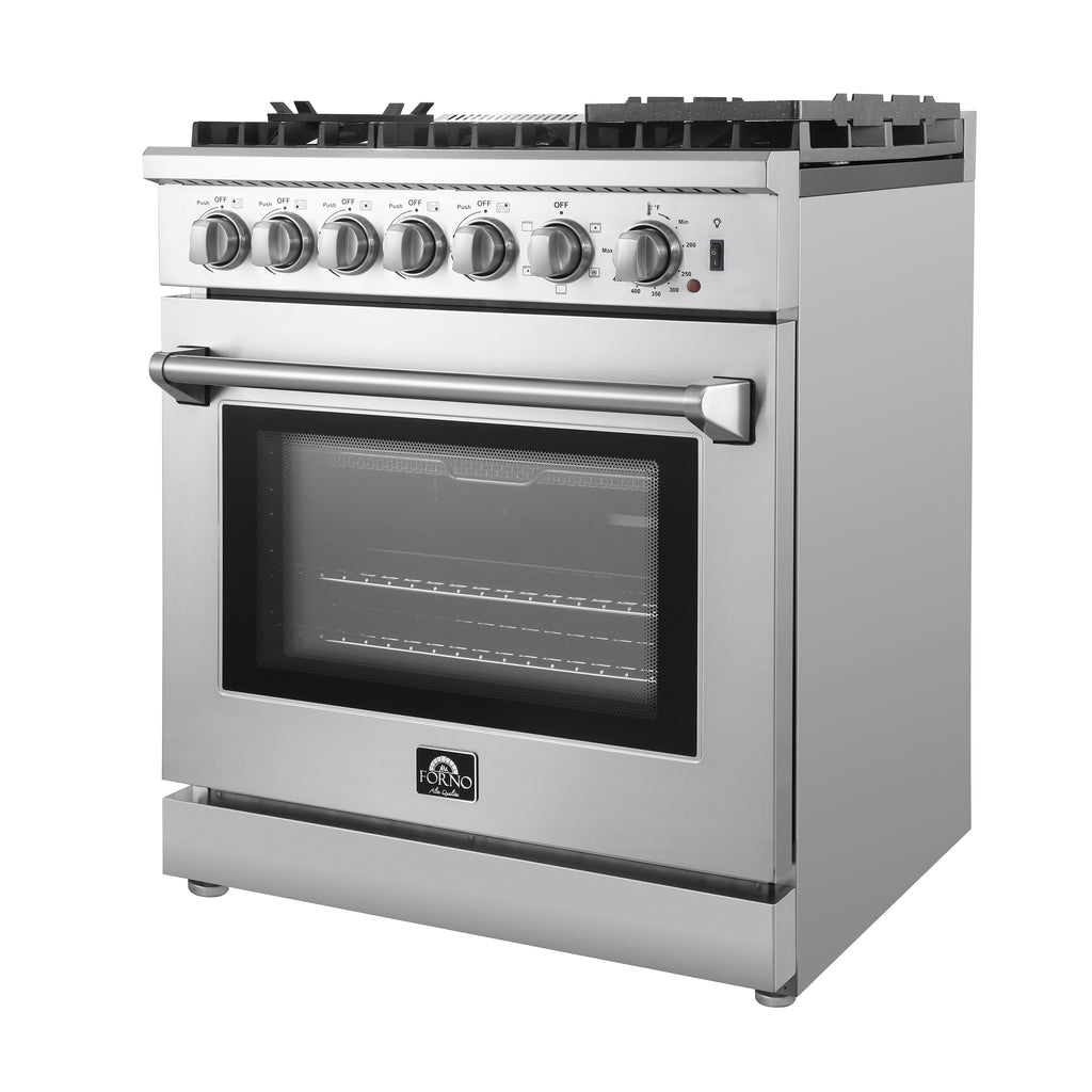 The Lazio 30 Inch Alta Qualita Dual Fuel Range blends professional design with durability. Its stainless-steel structure boasts 5 sealed burners (70,000 BTU total), including a potent dual-ring burner for boiling or searing and precise simmering. The continuous cast iron grates, wok ring, and reversible grill/griddle enhance cooking versatility. The 4.32 cu. ft. oven, with 6500 Watt combined convection broil and bake output, features an insulated 3-layer glass door for safety and visibility. The true convection element ensures fast, precise, and consistent cooking. Accessories include 2 oven racks, air fry rack & basket, drip pan (suitable for steam cleaning), and an LP conversion kit. Zinc-coated metal knobs with bezel rings ensure enduring beauty.