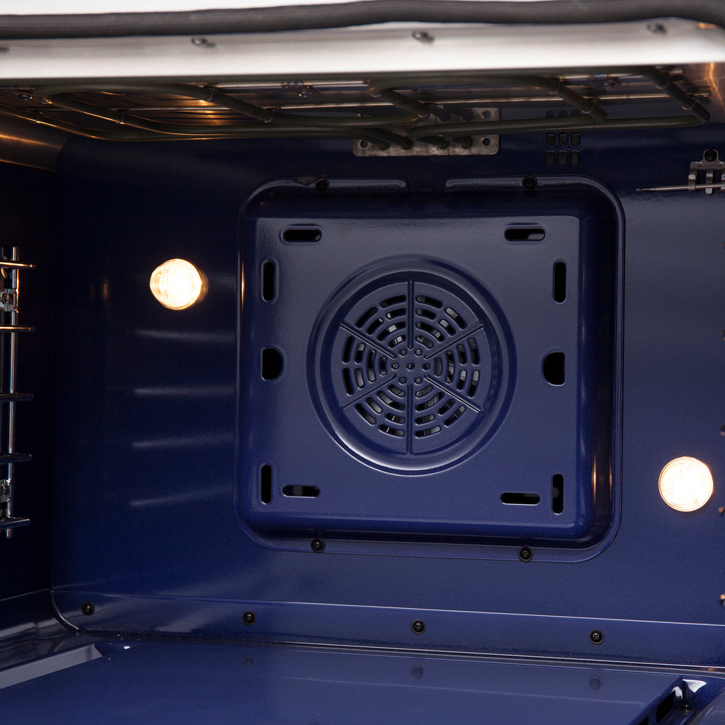 The Forno Massimo 30 Inch french door dual fuel range brings professional styling and Performance into your home kitchen with its durable stainless-steel design. Unique French doors offer generous clearance of up to 12 Inch or more, ensuring effortless access to your oven. The range top has 5 sealed burners, totaling 68,000 BTU, of which one is a 20,000 BTU dual-ring brass burner that can simmer at 1,000 BTU. The heavy-duty continuous cast iron grates allow maximum stability of cookware and mobility over a recessed enamel cooking surface, which keeps spills and splashes contained and easy to clean. The 4.32 cu.ft. true convection fan oven boasts a blue enamel interior, making cleaning a breeze. The 3-layer glass oven door window retains heat and provides a clear view. With a powerful 6,300 Watts output, this oven excels in baking, roasting, and broiling. Included are 2 telescopic oven racks, wok support, griddle, air-fryer kit with drip pan, a NEMA 14-50P power cord and an LP conversion kit. Housed in a high-grade stainless steel body with illuminated zinc knobs, the Massimo offers a stylish, long-lasting addition to your kitchen
