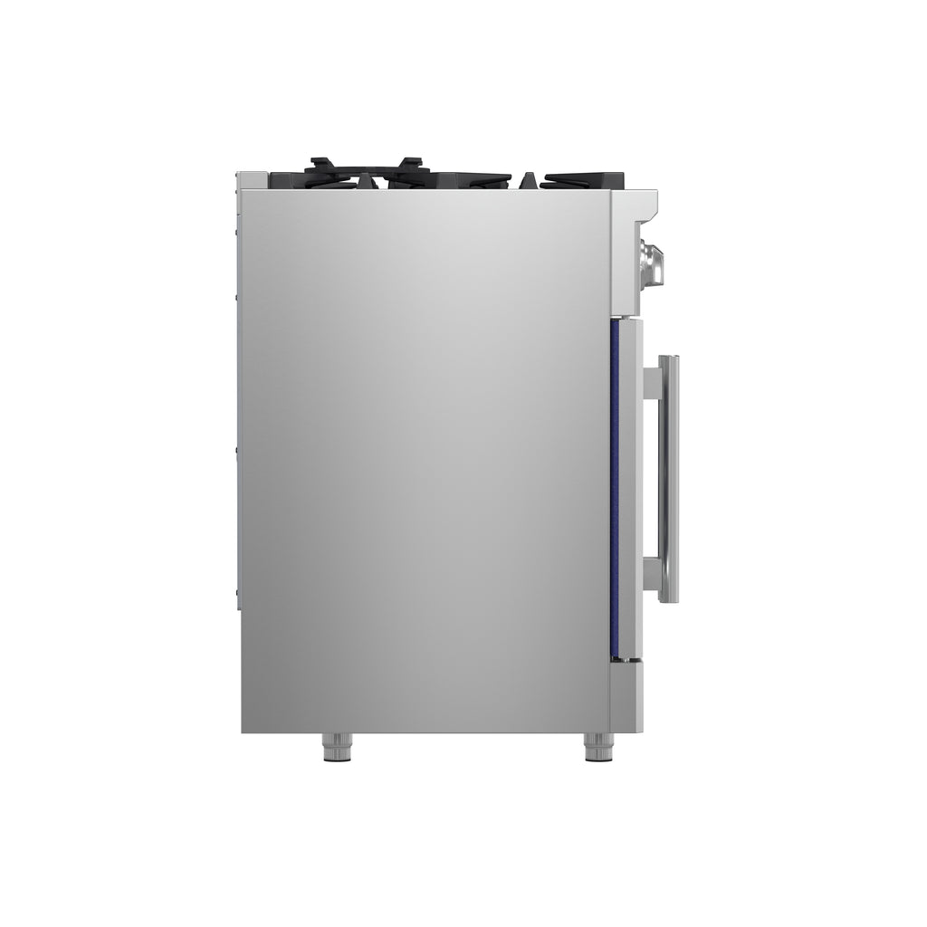 The Forno Massimo 30 Inch French Door Gas Range brings professional styling and Performance into your home kitchen with its durable stainless-steel design. Unique French doors offer generous clearance of up to 12 Inch or more, ensuring effortless access to your oven. The range top has 5 sealed burners, totaling 68,000 BTU, of which one is a 20,000 BTU dual-ring brass burner that can simmer at 1,000 BTU. The continuous cast iron grates ensure stability and mobility over the enamel surface that will contain any spills. The 4.32 cu. ft. gas oven with a total output of 30,000 BTU is encased in a speckled blue enamel interior fitted with a convection fan, ensures to achieve fast and consistent oven cooking along for easy viewing is a 3-layer glass oven door window. Included is an LP conversion kit, 2 telescopic oven racks, wok support, reversible griddle, air fryer kit and drip pan. Additionally, zinc coated illuminated metal knobs with bezel rings will maintain their beauty for years.