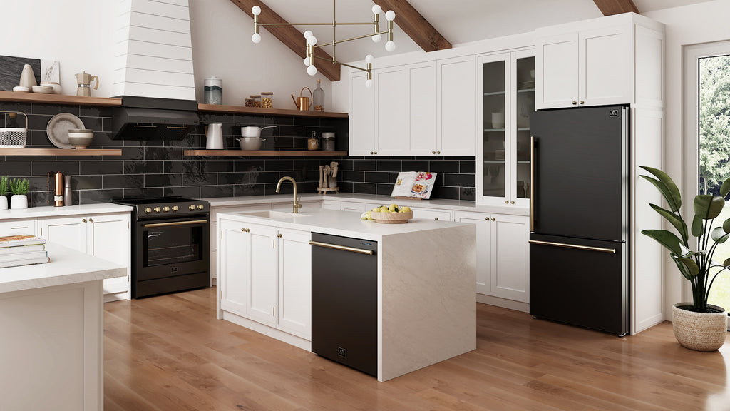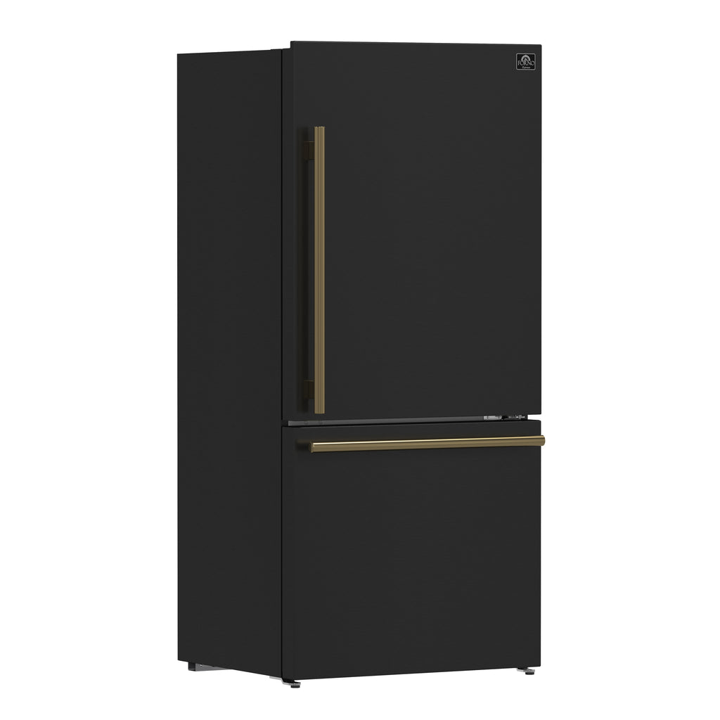 Introducing the FORNO 31 Inch Milano Espresso Bottom Freezer Refrigerator that seamlessly blends style and functionality. Its compact 31 Inch size and 17.2 cu ft capacity offer ample storage without compromising aesthetics. Two full-width freezer drawers optimize organization, while digital touch control ensures precise temperature settings and real-time monitoring. The black finish door maintains a modern look effortlessly. Swift temperature adjustment with Super Cool and Super Freeze safeguards your groceries quality. ENERGY STAR Certified for efficiency, and high-efficiency LED lighting reduces food spoilage. Antique brass handles add an elegant touch, and adjustable features, including shelves, door bins, and a full-width crisper drawer, enhance user-friendliness. Upgrade your kitchen with style, convenience, and freshness!