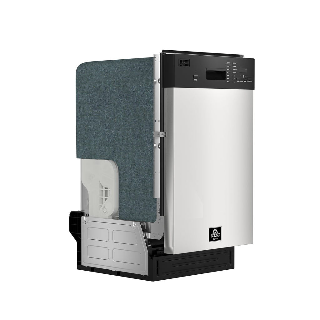 The Forno Polo 18" Dishwasher delivers powerful cleaning performance in a compact design, making it ideal for small kitchens, apartments, and tight spaces. Its sleek stainless steel finish adds a modern touch while ensuring durability and easy maintenance. With multiple wash cycles, including Heavy, Normal, and Quick Wash, this dishwasher adapts to your needs for a spotless clean every time. The adjustable top rack accommodates tall items up to 11 inches, while the dual spray arm system provides thorough, streak-free washing. Designed for efficiency, it is Energy Star Certified, helping reduce utility costs without compromising performance. Enjoy a quieter kitchen with ultra-low 52 dBA operation, and experience the convenience of a heated drying system that leaves dishes spotless and ready to use. With a user-friendly front control panel, a child lock safety feature, and an ADA-compliant design, the Polo combines compact convenience with premium functionality.