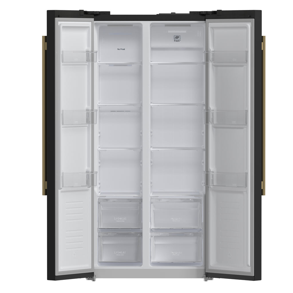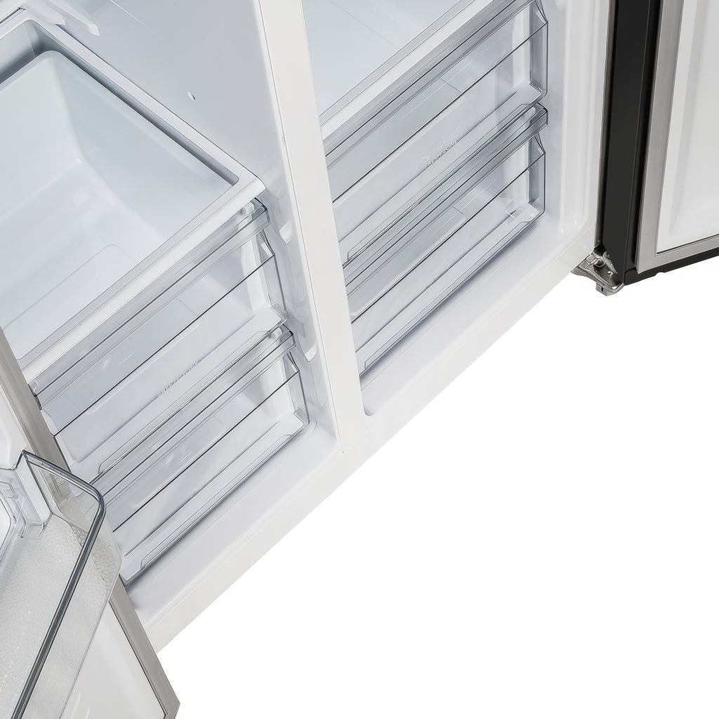 Upgrade your kitchen with the Forno Salerno 33" Side-by-Side Refrigerator, designed for functionality and energy-efficient performance. With a 15.6 cu. ft. total capacity, this frost-free refrigerator ensures hassle-free maintenance while keeping your food fresh. Equipped with an advanced temperature control system, this refrigerator maintains optimal cooling levels to preserve food and beverages. The intuitive LED touch panel offers effortless access to settings and controls. The fresh food compartment provides 9.54 cu. ft. of storage space, featuring three adjustable glass shelves, two crisper drawers, and three door bins for organized food storage. The freezer section offers 6.08 cu. ft. of capacity, complete with three adjustable shelves, two pull-out drawers, and three door bins, ensuring easy access to frozen essentials. With Energy Star Certification, the Forno Salerno delivers reliable performance while reducing energy consumption.