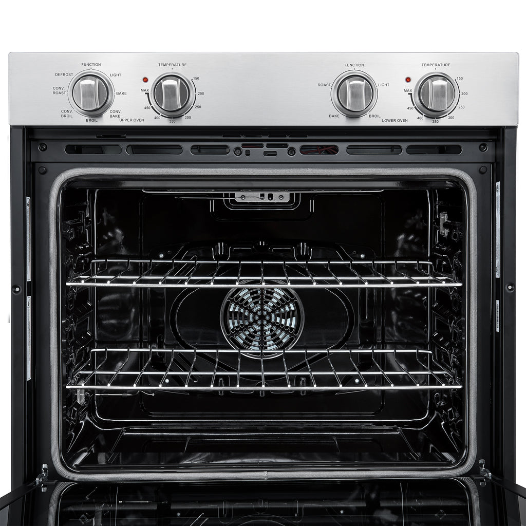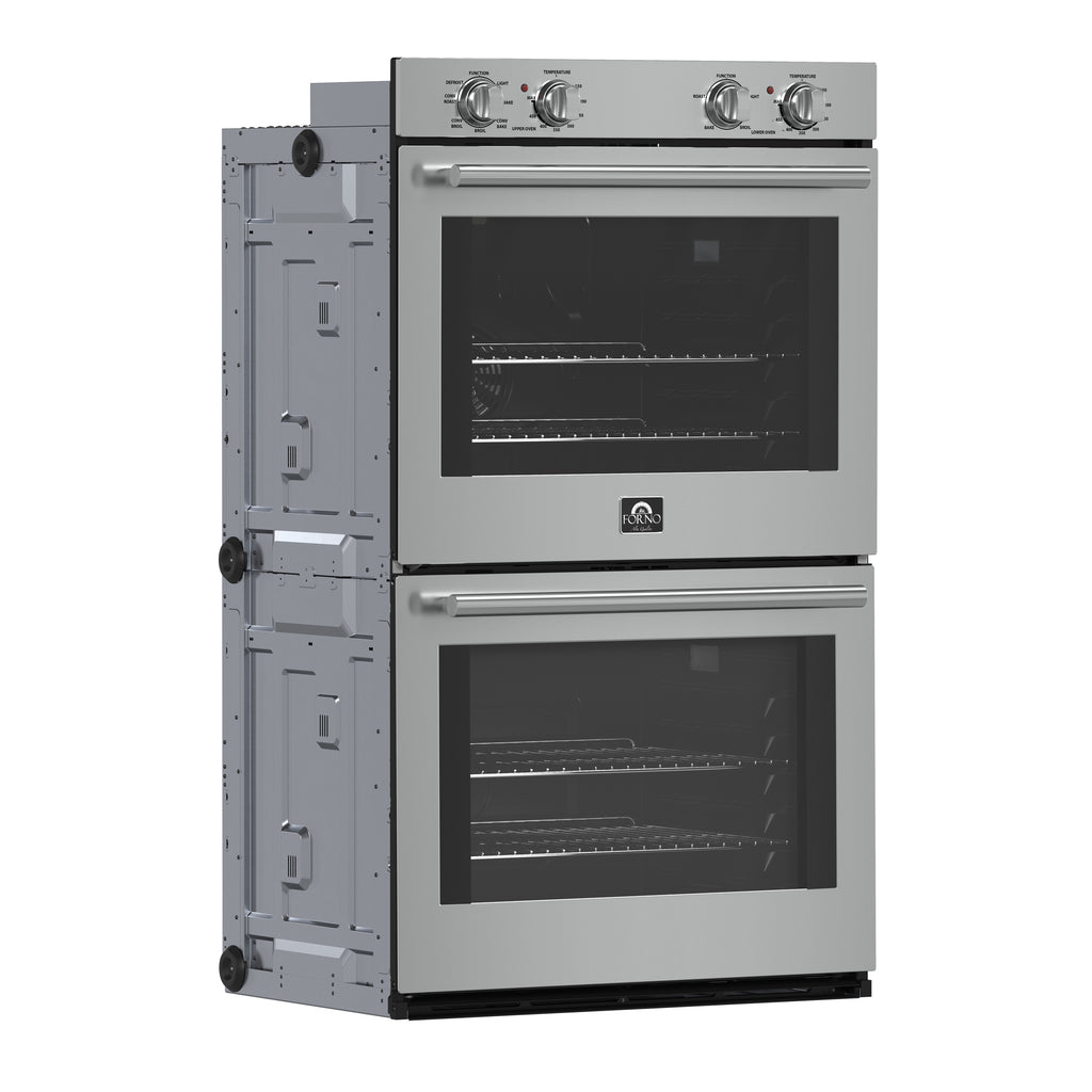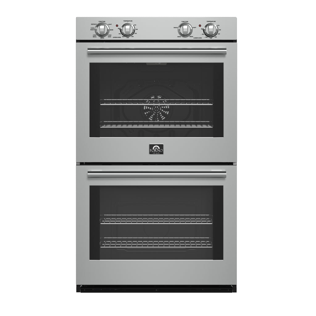 The Forno Vomero 30-Inch Double Wall Oven in stainless steel is perfect for everything from weeknight meals to holiday feasts. With a total of 10 cu. ft., you can cook multiple dishes at once for big gatherings. The upper oven offers 6 versatile cooking modes: Bake, Convection Bake, Broil, Convection Broil, Convection Roast, and Defrost, with a 2000W broiler, 1500W bake element, and 50W convection fan for even, efficient heating. The lower oven, equipped with a 2000W broiler and 1500W bake element, is a traditional oven without a convection fan - ideal for classic roasting and baking.