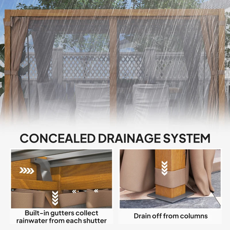 Outsunny 10' x 13' Outdoor Retractable Pergola w/ Sun Shade Louvered Top, Pergola w/ Canopy, Curtains, Netting, Natural Wood