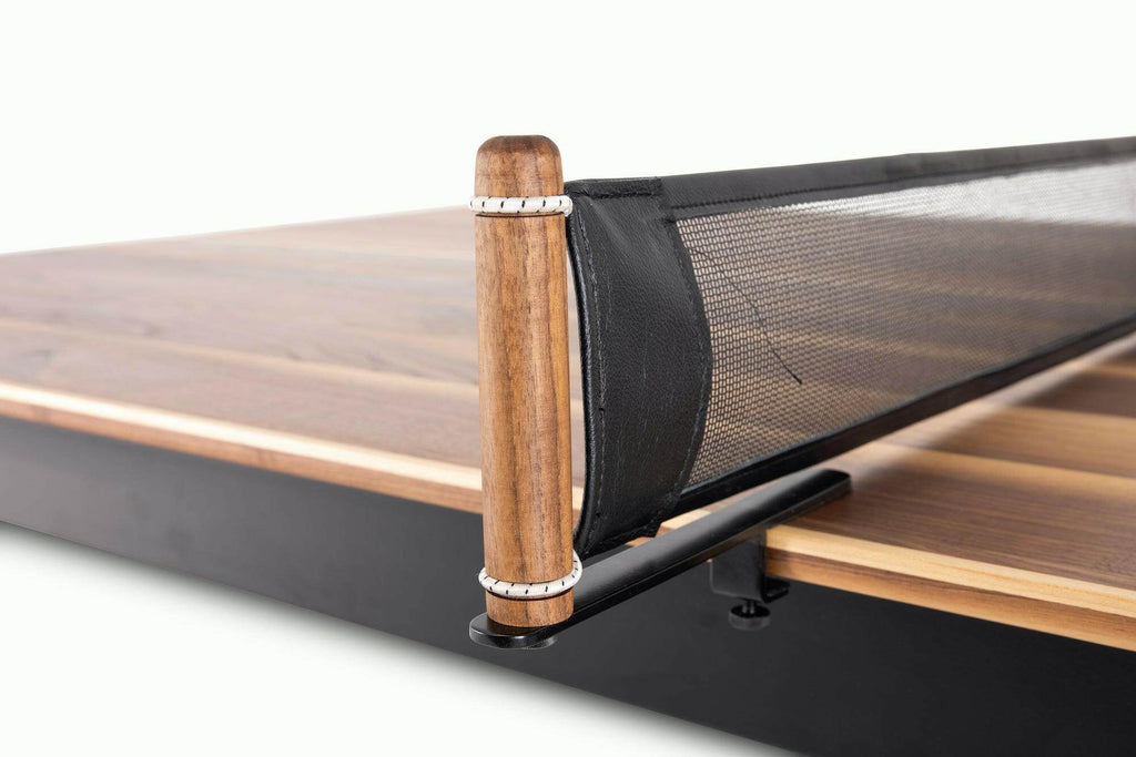 With its ornate column-inspired legs hand-turned on a lathe, the Revival Ping Pong Table is a testament to "Attention to detail is the religion of success.” The net easily sleeves on and off, seamlessly transitioning to a dining table for 8-10. Finished with a natural, food-safe hand-rubbed oil and wax. Includes two paddles, three balls, and a wall-mounted rack. Available in walnut, oak, or maple with your choice of powder coat finish. Comes in ITTF regulation size but custom sizes and other add-ons available.