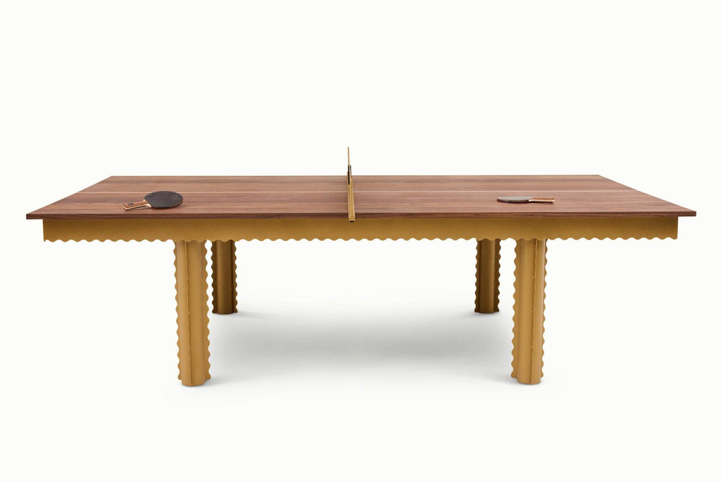 Includes two handmade paddles, three balls, and a wall-mounted rack. Squiggles Ping Pong Table is available in walnut, oak, or maple with your color choice of powder coat finish.
