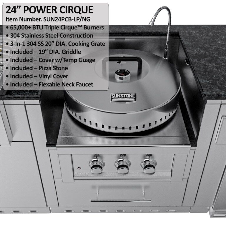 • 3-in-1 grates, 19" solid steel griddle, vented cover with temperature gauge, and cold-water faucet.