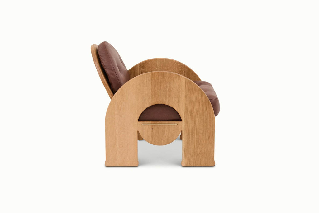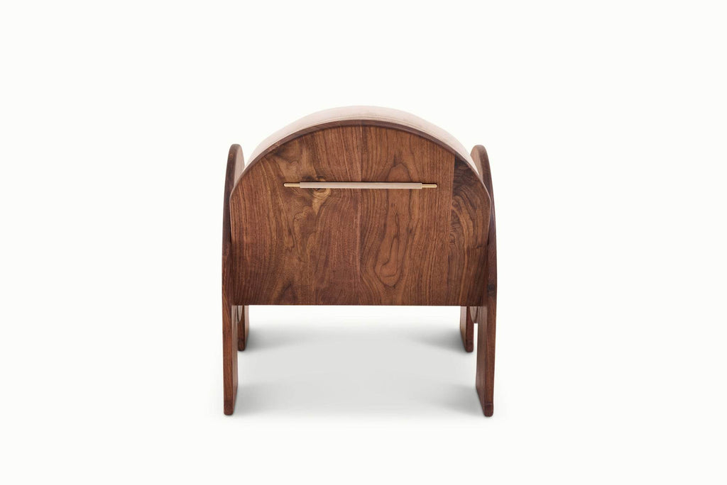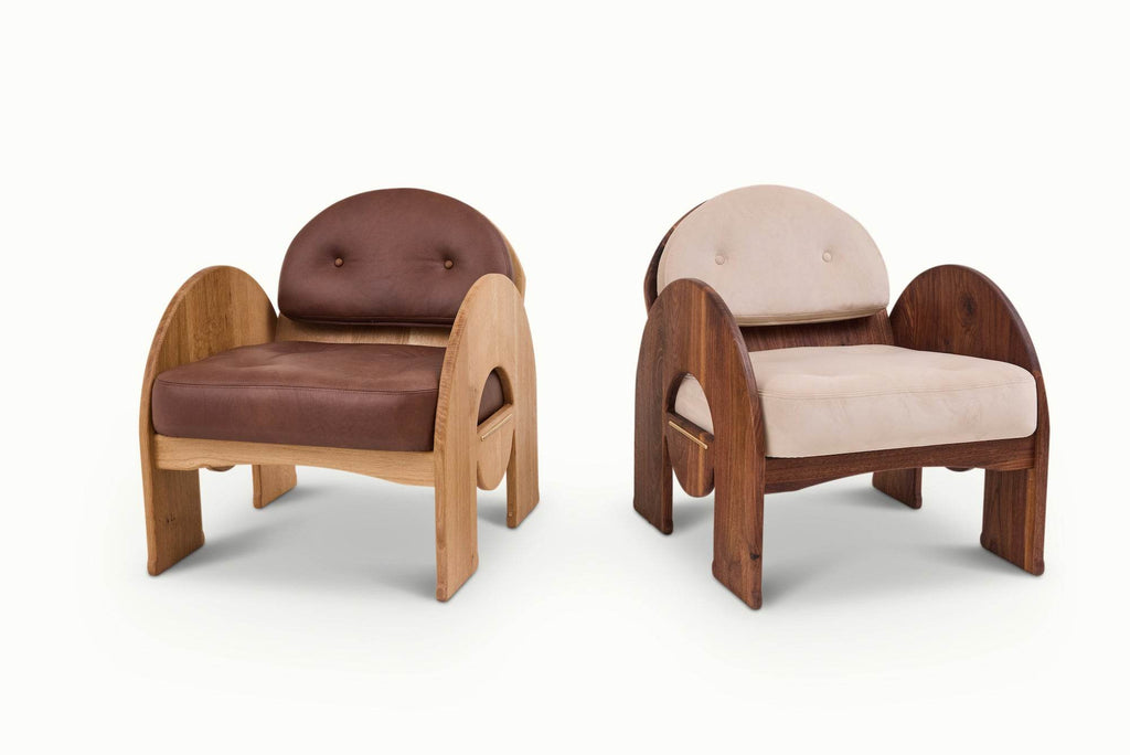 The Uma Chair is a comfy lounge chair with flair and elegance, partially inspired by art deco aesthetic and a bit of mid century design, paired with modern detailing. A solid wood base supports the memory foam upholstery on Uma. Brass trim is a snappy, added detail on the back and sides of the Uma Chair.