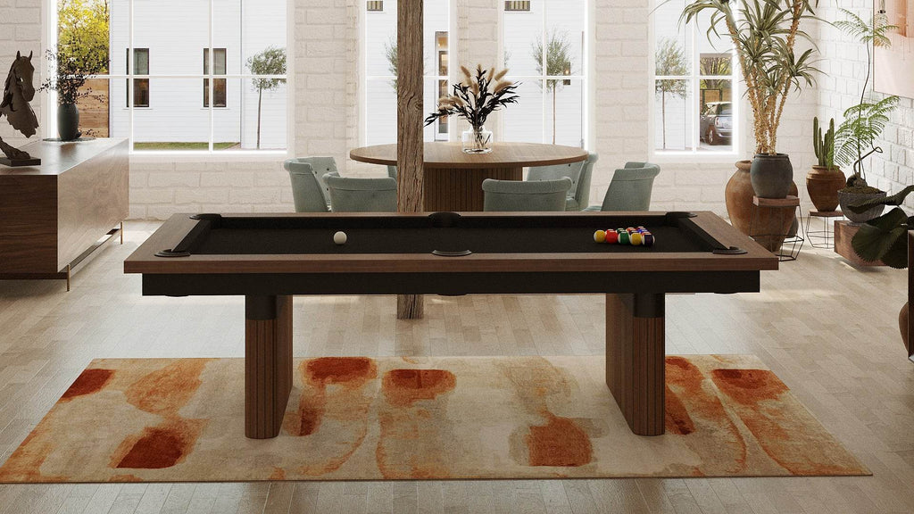 Adapted from our popular vertical revival shuffleboard table, the Vertical Revival Pool Table merges meticulous craftsmanship with timeless design. Solid hardwood legs, turned and fluted, support a similarly adorned top rail. The robust legs ensure stability, enough to dance on in victory. The base features a custom steel radius to seamlessly match the leg profile, demonstrating extraordinary craftsmanship. This table is not only a player's delight but a stunning piece of furniture that enhances any room. Available in walnut, oak, or maple with your choice of felt and powder coat color.